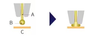 1.캐필러리라는 주사기같은 원통형 물체에 금선을 통과시켜 사용합니다. 고전압으로 스파크를 일으켜 와이어 선단을 둥글게 만들고 그 부분을 접속시킬 전극에 접합합니다. 이를 Ball Bonding 또는 1st Bonding이라고 합니다. 접합은 캐필러리에 의한 하중과 초음파, 그리고 본딩 스테이지의 열에 의해 이루어집니다.